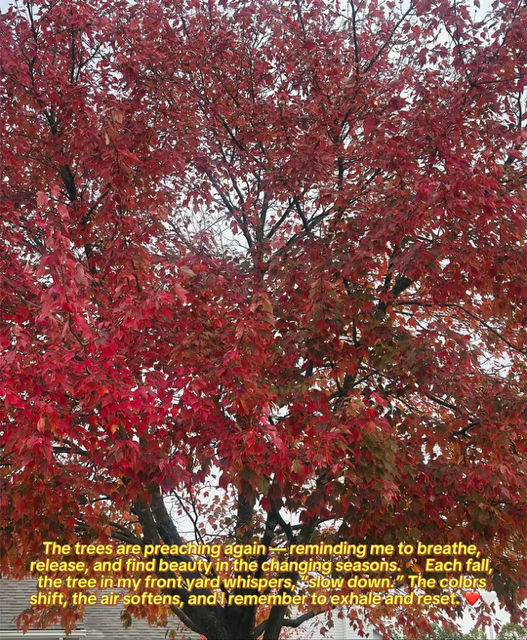 Yesterday was my first time worshiping in person at my church since late August. Walking through those doors felt like a homecoming — the music, the word, the hugs, the presence. It was a balm to my soul. And as I came back, I also entered into my favorite season — fall. The beauty of the tree in my front yard greets me each morning, reminding me to slow down, breathe, and take in what God is doing right here, right now.