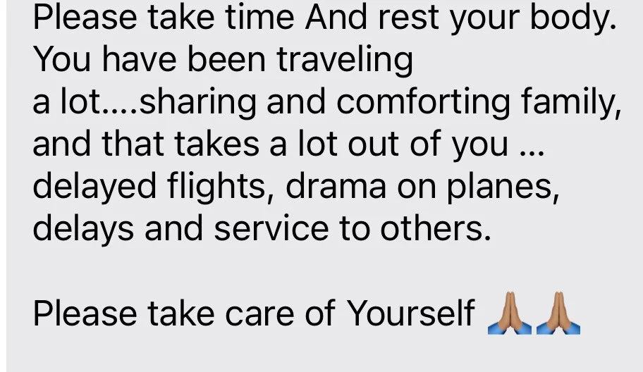 These words from a loved one landed in my spirit like a balm when they popped up on my phone. This week, I have been moving, grieving, serving,being served, flying, comforting, being comforted, navigating delayed flights, hours in airports, early mornings, and late nights—offering myself to others while my own body whispered, “Pause.”